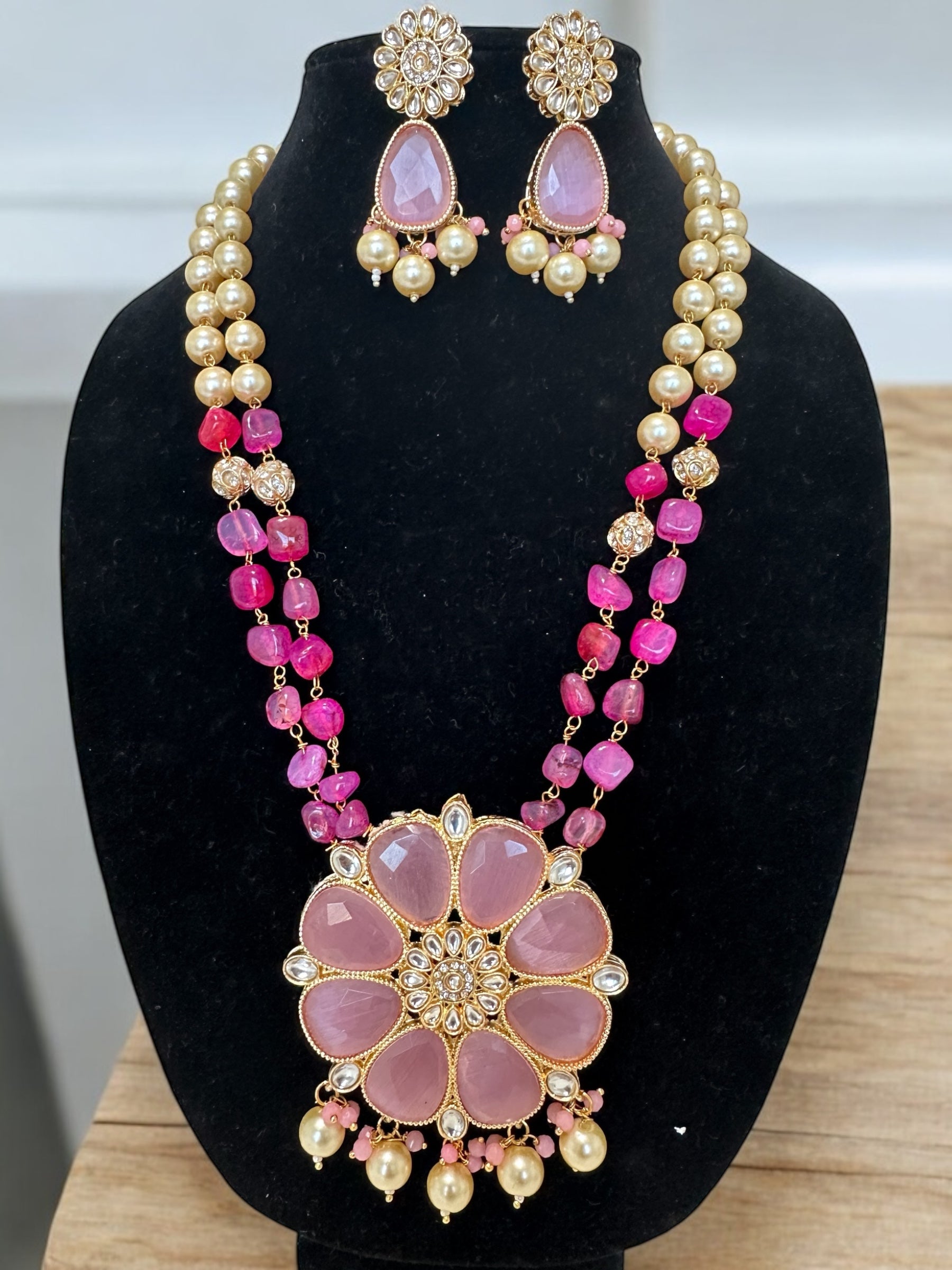Flower Pendant with Kundans.\r\nLong Chain is made up of Real Ruby Glass Beads and Pearls.\r\nBeads last long with minimal care.