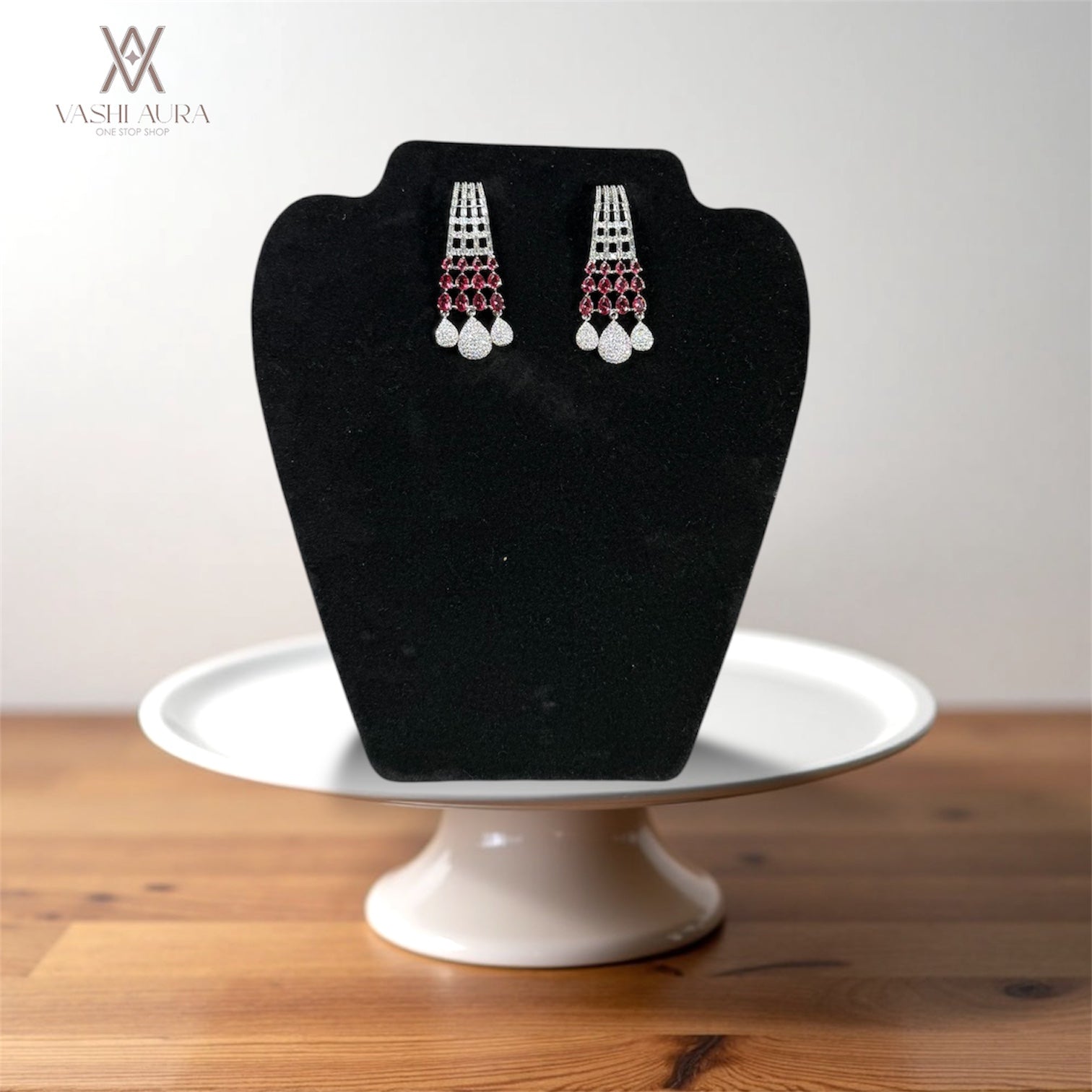 Long earrings featuring white CZs on the upper section, complemented by red CZs in the middle and finished with elegant drops at the bottom.