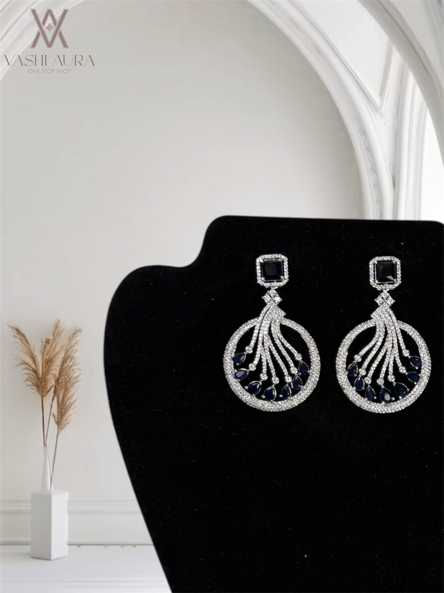 Royal Blue Square CZ on Stud and Round CZ with Blue Drops on Bottom of the hanging circle
